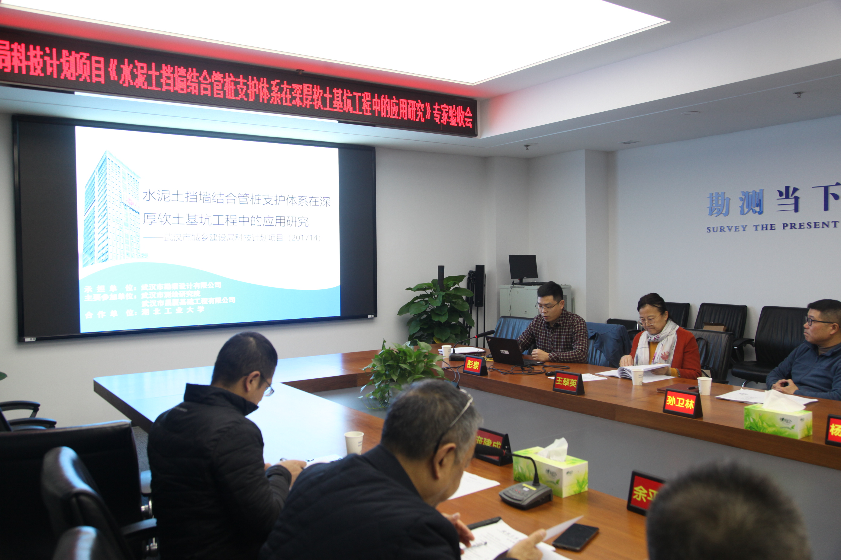 12月15日,武漢市城鄉建設局組織武漢土木建筑協會有關專家組,在公司1717會議室召開科研項目驗收會。公司與武漢市測繪研究院、湖北工業大學、武漢市昌廈基礎工程有限責任公司共同承擔完成的《水泥土擋墻結合管樁支護體系在深厚軟土基坑工程中的應用研究》(項目編號 201714)科研項目順利通過驗收。武漢市城鄉建設局勘察設計與科技處處長徐蘭,公司總經理施木俊等領導參加會議。