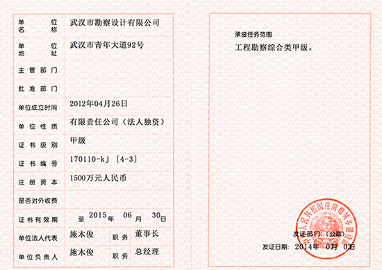 在我院領(lǐng)導(dǎo)的指導(dǎo)關(guān)心下,經(jīng)過(guò)管理部門(mén)長(zhǎng)久以來(lái)的大力支持以及全院相關(guān)人員的協(xié)作和努力,7月3日,我院勘察公司喜獲國(guó)家住建部頒發(fā)的工程勘察綜合類(lèi)甲級(jí)資質(zhì)證書(shū)。