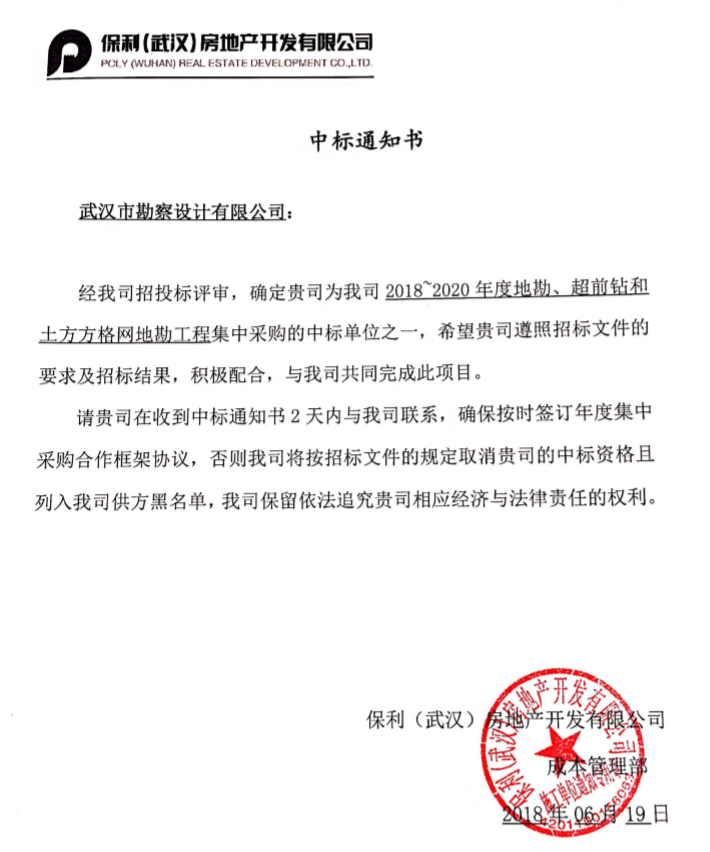 公司中標保利(武漢)房地產開發有限公司2018-2020年度勘察項目